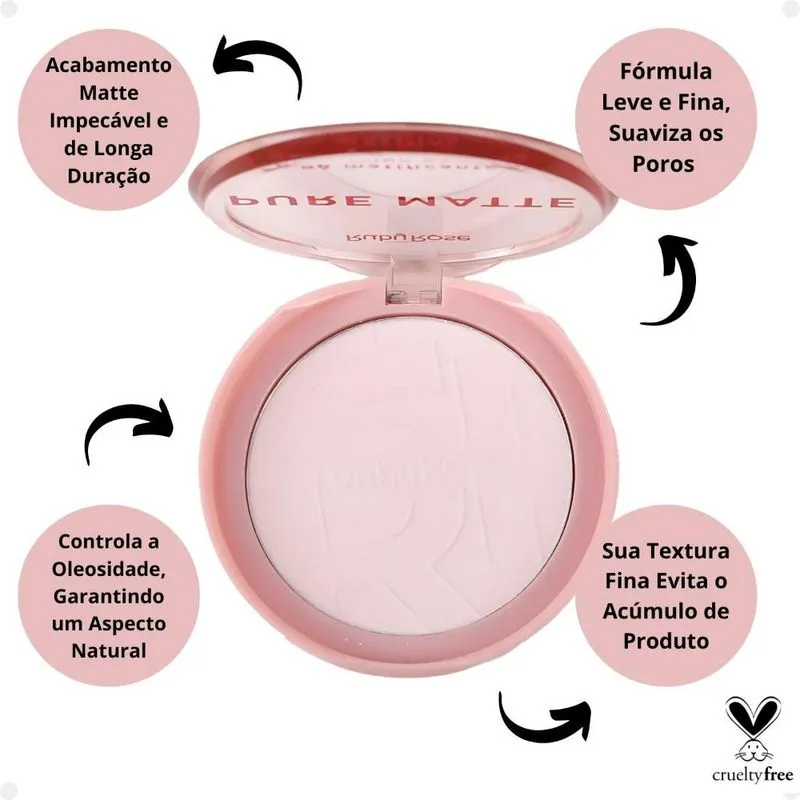 Modo de Uso Após a aplicação da base e do corretivo, Com o auxílio de um pincel ou esponja, aplique o pó nas áreas desejadas do rosto, como a Zona T (testa, nariz e queixo) espalhando-o de maneira uniforme para um acabamento natural. Retire o excesso do produto com um pincel. Perguntas Frequentes O pó é adequado para todos os tipos de pele? Sim, o Pó Matificante Pure Matte Ruby Rose é indicado para todos os tipos de pele, especialmente para peles oleosas, pois ajuda a controlar o brilho e a oleosidade. Qual é a durabilidade do produto na pele? O Pó Matificante Pure Matte Ruby Rose proporciona um acabamento duradouro, mantendo a pele com aparência fresca e sem brilho por várias horas após a aplicação. O Pó Matificante Pure Matte Ruby Rose tem alguma fragrância? Não, o produto é livre de fragrâncias, o que o torna ideal para pessoas com pele sensível ou que preferem produtos sem cheiro. Ele é adequado para peles maduras? Sim, o pó tem uma textura fina e leve, o que evita acúmulo nas linhas finas e nas áreas de expressão. Ele proporciona um acabamento suave, sem deixar a pele com aspecto pesado, sendo adequado também para peles maduras. O pó ajuda a disfarçar os poros? Sim, a fórmula do Pó Matificante Pure Matte ajuda a suavizar a aparência dos poros, deixando a pele com um acabamento mais liso e sem brilho. O produto pode ser usado por quem tem acne ou pele com tendência a espinhas? Sim, o Pó Matificante Pure Matte Ruby Rose é indicado para peles oleosas e com tendência à acne, pois controla o brilho sem obstruir os poros. No entanto, sempre é bom testar o produto em uma pequena área antes de aplicar em todo o rosto, para garantir que não cause irritações. . Código de Registro Sanitário (ANVISA) 25351.350709/2024-45
